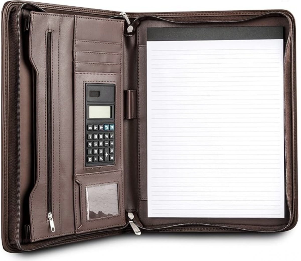 Premium Business Portfolio with Zipper – Padfolio - Superior Business Impressions Begin with PU Vegan Leather, 10.1 Inch Tablet Sleeve, Smart Storage, Solar Calculator, Writing Pad - Brown